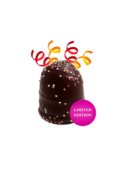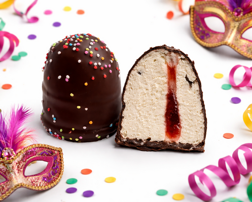 Festlig fettisdagens gräddbulle med krämigt skum smaksatt med lyxig vanilj, jordgubbsfyllning, marsipanbotten gjord på rå marsipan med 52% mandlar, täckt med ett tjockt lager mörk belgisk choklad och toppad med kokos. Tillsammans harmoniserar de goda ingredienserna till en symfoni av smaker utöver det vanliga.
